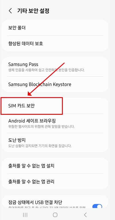 - 안드로이드 12 / 11 / 10 / 9: 설정 → 생체 인식 및 보안 → 기타 보안 설정 → USIM 카드 잠금 설정 → ‘다른 SIM 사용 제한’ 해제