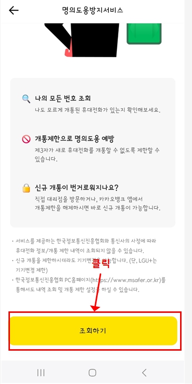 생각보다 많은 분들이 카카오뱅크 앱에 이런 기능이 있다는 걸 몰라요. 카카오뱅크 앱을 열고 하단 '더보기' 메뉴로 들어가세요. ‘인증/보안’ 탭에서 ‘명의도용방지 서비스’ 항목을 확인할 수 있습니다. 클릭하면 역시 본인 인증과 약관 동의 절차가 진행되죠.