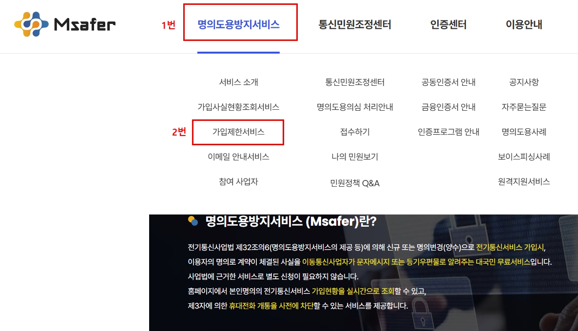 - ‘가입제한 서비스’ 메뉴 클릭 후 전체 통신사 개통 제한 설정