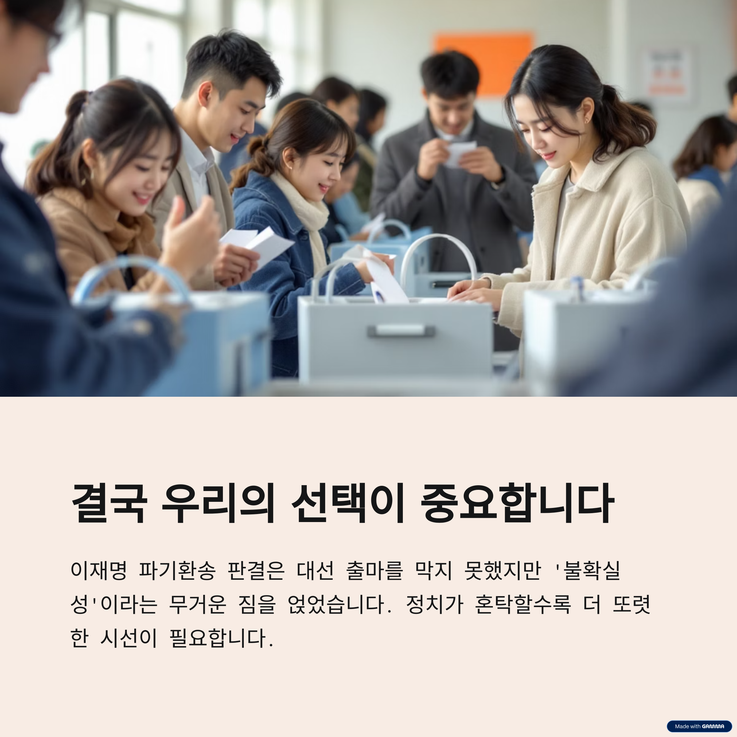이번 이재명 파기환송 판결은 그의 대선 출마를 가로막지는 못했지만, ‘불확실성’이라는 무거운 짐을 함께 얹어버렸습니다.