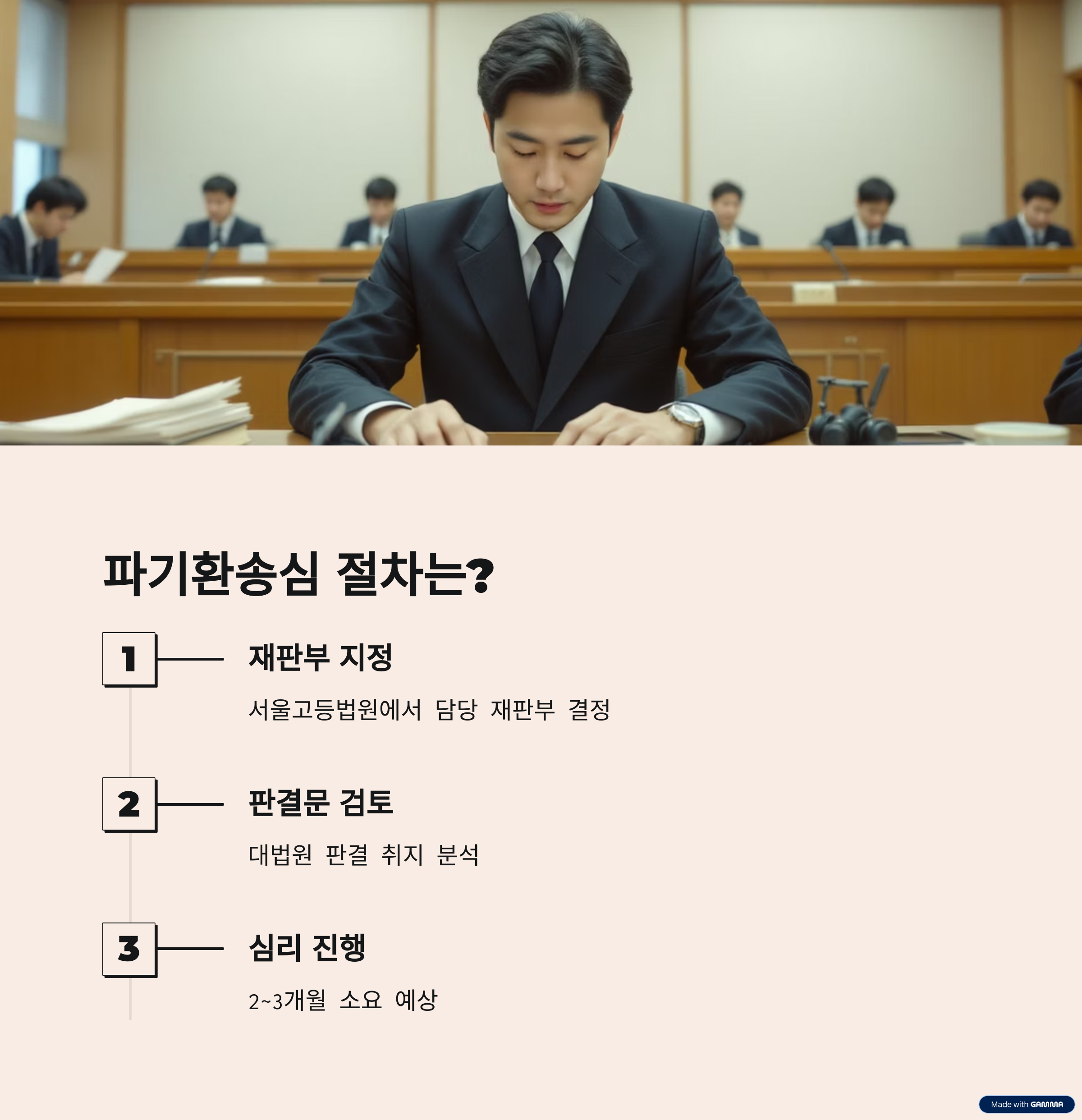 이제 사건은 다시 서울고등법원으로 돌아갔습니다. 파기환송심이라고 해서 바로 재판이 시작되는 건 아니에요. 먼저 재판부가 정해지고, 대법원 판결문을 검토한 뒤, 새로운 심리를 위한 준비가 이루어집니다.