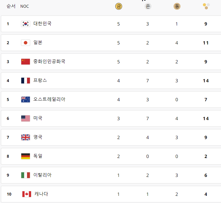 2024 파리올림픽에서 대한민국 선수단은 기대를 뛰어넘는 초반 성적을 기록하며 세계의 주목을 받고 있습니다. 앞으로 남은 일정에서도 좋은 성과를 이어가기를 기대하며, 대한민국 선수들에게 많은 응원과 격려를 보냅니다. 이번 파리올림픽을 통해 다시 한번 대한민국 스포츠의 저력을 전 세계에 알릴 수 있기를 바랍니다.