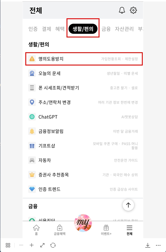- 카카오뱅크 앱 → 전체 → 인증/보안 → 명의도용방지 서비스 신청